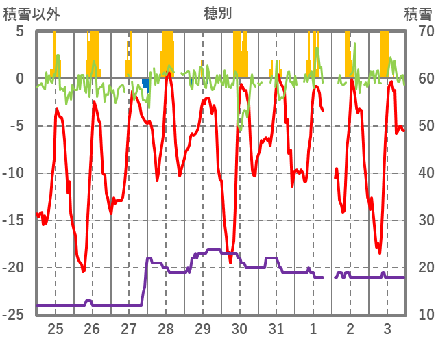 | 日 | 時 | 気温 | 降水 | 風向/風速 | 日照 | 積雪 | 降雪 |