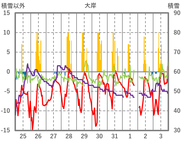 | 日 | 時 | 気温 | 降水 | 風向/風速 | 日照 | 積雪 | 降雪 |