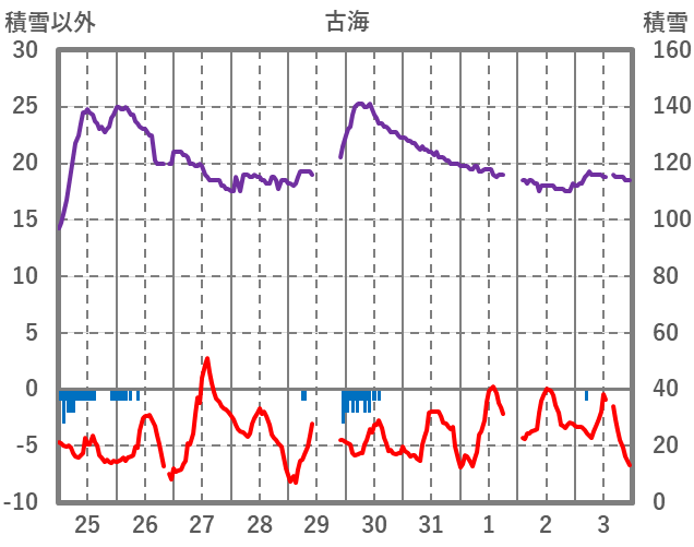 | 日 | 時 | 気温 | 降水 | 風向/風速 | 日照 | 積雪 | 降雪 |