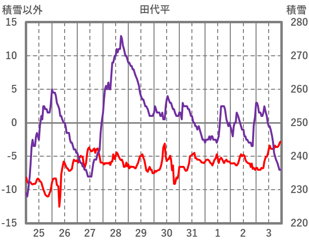 | 日 | 時 | 気温 | 降水 | 風向/風速 | 日照 | 積雪 | 降雪 |