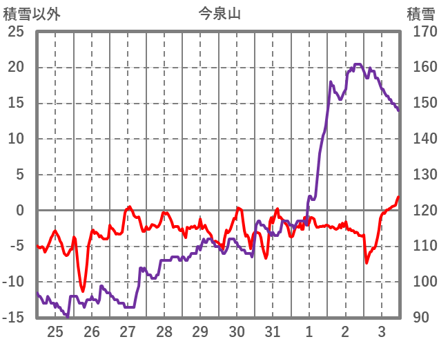 | 日 | 時 | 気温 | 降水 | 風向/風速 | 日照 | 積雪 | 降雪 |