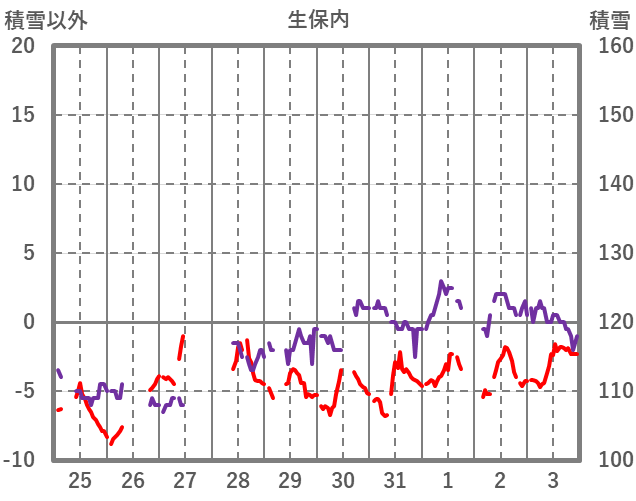 | 日 | 時 | 気温 | 降水 | 風向/風速 | 日照 | 積雪 | 降雪 |
