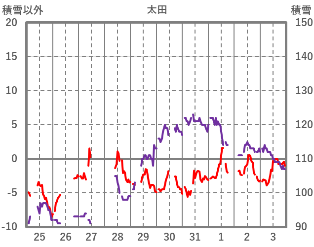 | 日 | 時 | 気温 | 降水 | 風向/風速 | 日照 | 積雪 | 降雪 |