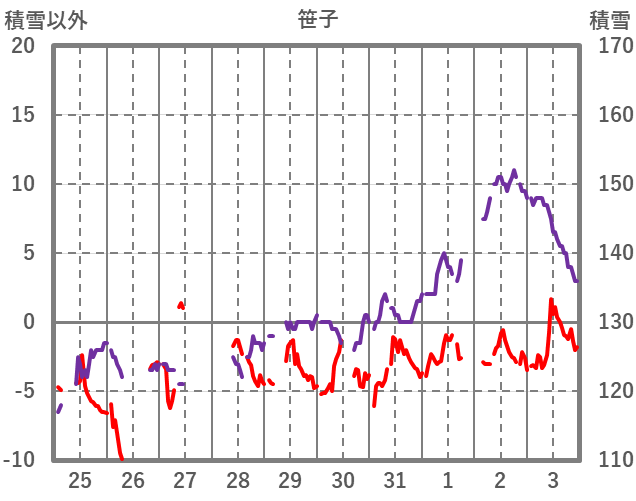 | 日 | 時 | 気温 | 降水 | 風向/風速 | 日照 | 積雪 | 降雪 |