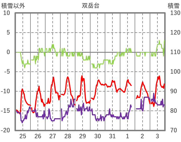 | 日 | 時 | 気温 | 降水 | 風向/風速 | 日照 | 積雪 | 降雪 |