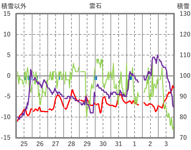 | 日 | 時 | 気温 | 降水 | 風向/風速 | 日照 | 積雪 | 降雪 |
