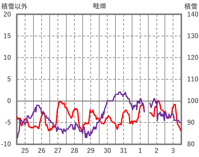 | 日 | 時 | 気温 | 降水 | 風向/風速 | 日照 | 積雪 | 降雪 |