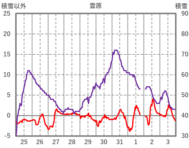 | 日 | 時 | 気温 | 降水 | 風向/風速 | 日照 | 積雪 | 降雪 |