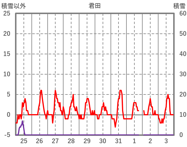 | 日 | 時 | 気温 | 降水 | 風向/風速 | 日照 | 積雪 | 降雪 |