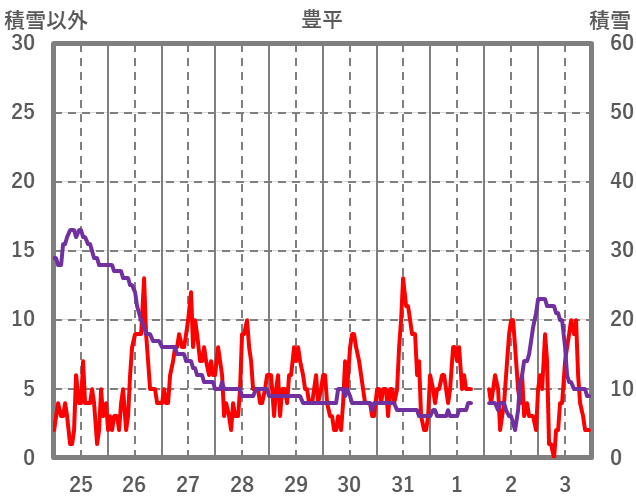 | 日 | 時 | 気温 | 降水 | 風向/風速 | 日照 | 積雪 | 降雪 |