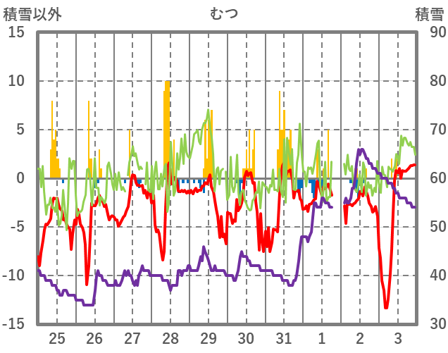 | 日 | 時 | 気温 | 降水 | 風向/風速 | 日照 | 積雪 | 降雪 |