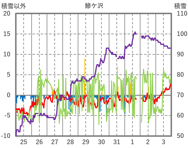 | 日 | 時 | 気温 | 降水 | 風向/風速 | 日照 | 積雪 | 降雪 |
