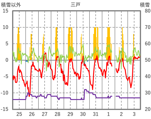 | 日 | 時 | 気温 | 降水 | 風向/風速 | 日照 | 積雪 | 降雪 |