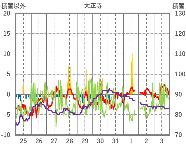 | 日 | 時 | 気温 | 降水 | 風向/風速 | 日照 | 積雪 | 降雪 |