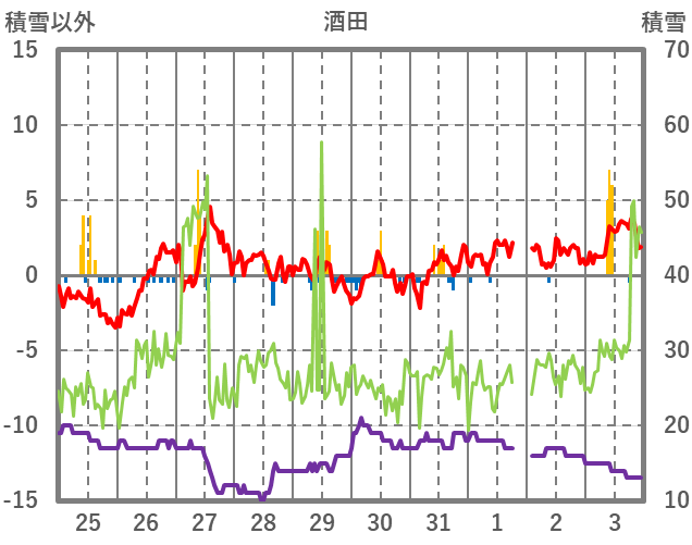 | 日 | 時 | 気温 | 降水 | 風向/風速 | 日照 | 積雪 | 降雪 |
