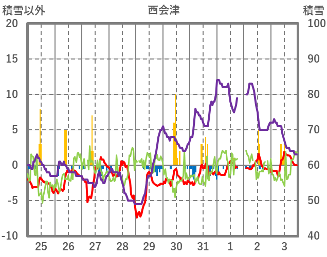 | 日 | 時 | 気温 | 降水 | 風向/風速 | 日照 | 積雪 | 降雪 |