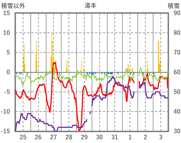 | 日 | 時 | 気温 | 降水 | 風向/風速 | 日照 | 積雪 | 降雪 |