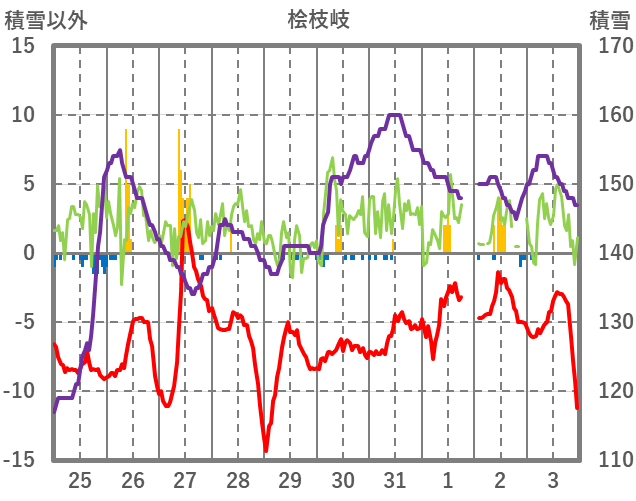| 日 | 時 | 気温 | 降水 | 風向/風速 | 日照 | 積雪 | 降雪 |