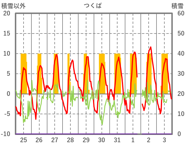 | 日 | 時 | 気温 | 降水 | 風向/風速 | 日照 | 積雪 | 降雪 |