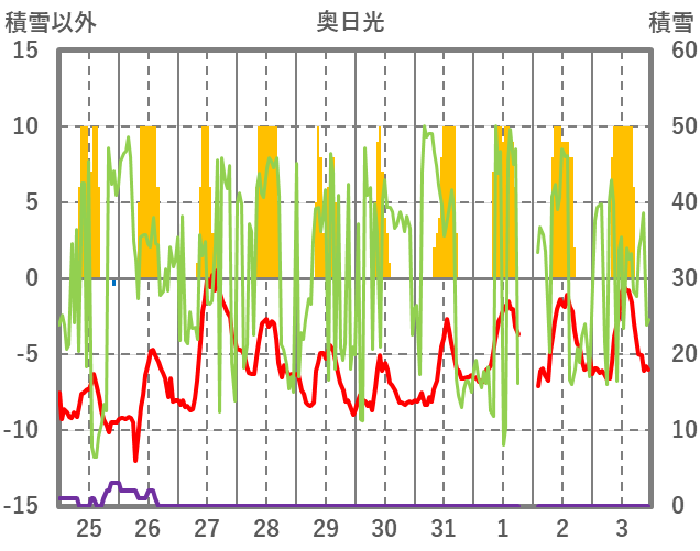 | 日 | 時 | 気温 | 降水 | 風向/風速 | 日照 | 積雪 | 降雪 |