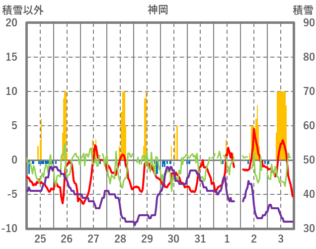 | 日 | 時 | 気温 | 降水 | 風向/風速 | 日照 | 積雪 | 降雪 |