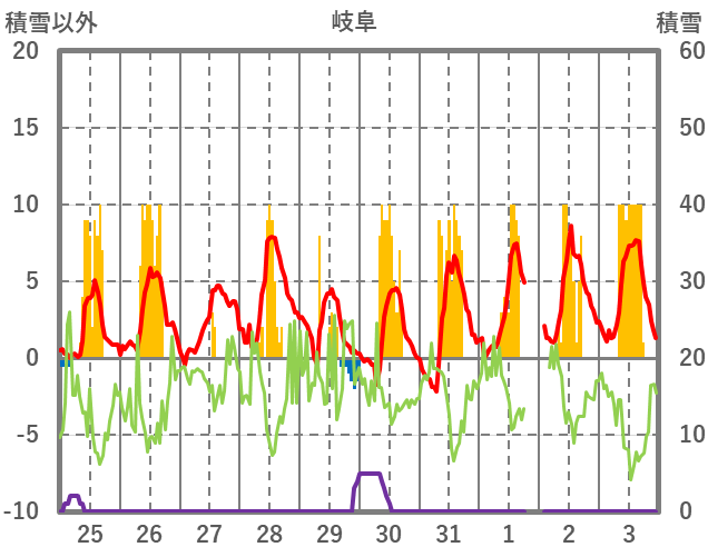 | 日 | 時 | 気温 | 降水 | 風向/風速 | 日照 | 積雪 | 降雪 |