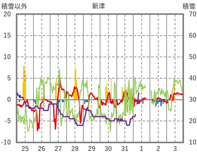 | 日 | 時 | 気温 | 降水 | 風向/風速 | 日照 | 積雪 | 降雪 |