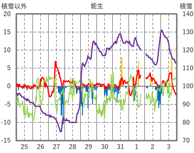 | 日 | 時 | 気温 | 降水 | 風向/風速 | 日照 | 積雪 | 降雪 |