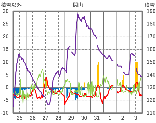 | 日 | 時 | 気温 | 降水 | 風向/風速 | 日照 | 積雪 | 降雪 |
