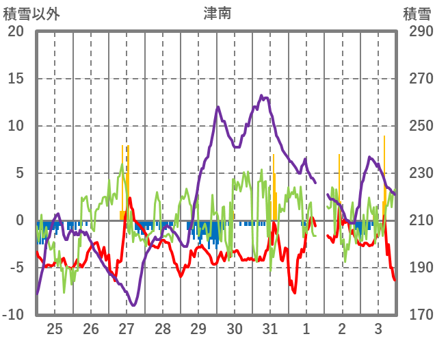 | 日 | 時 | 気温 | 降水 | 風向/風速 | 日照 | 積雪 | 降雪 |