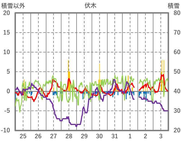 | 日 | 時 | 気温 | 降水 | 風向/風速 | 日照 | 積雪 | 降雪 |