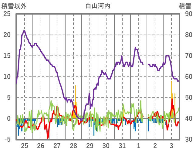 | 日 | 時 | 気温 | 降水 | 風向/風速 | 日照 | 積雪 | 降雪 |