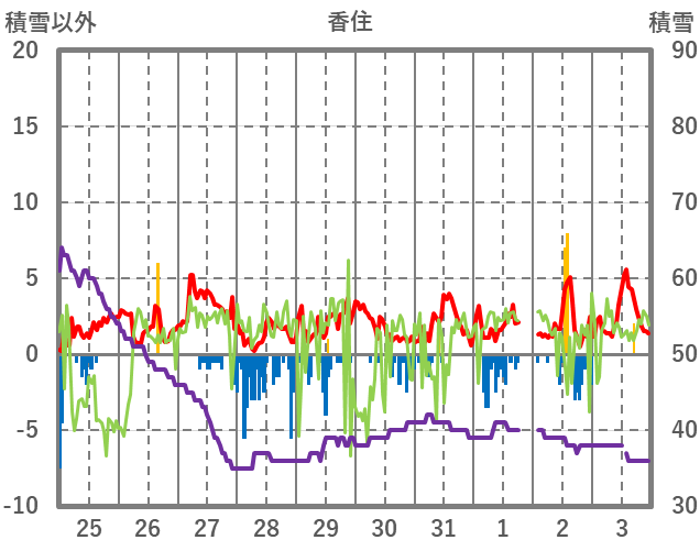 | 日 | 時 | 気温 | 降水 | 風向/風速 | 日照 | 積雪 | 降雪 |