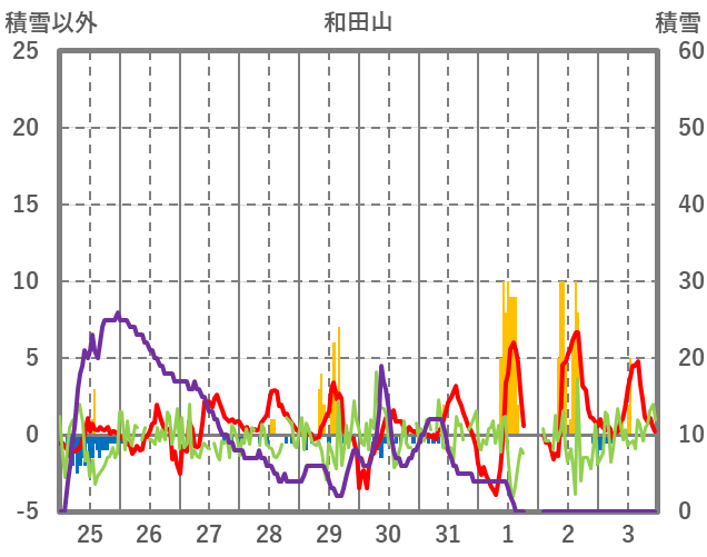 | 日 | 時 | 気温 | 降水 | 風向/風速 | 日照 | 積雪 | 降雪 |