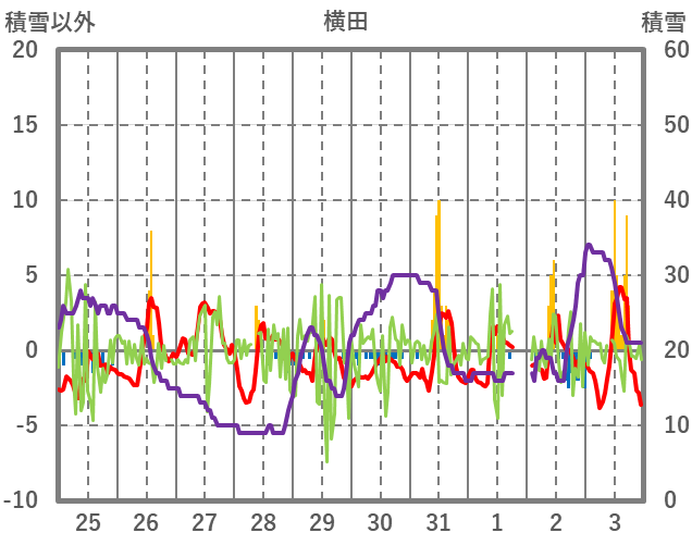 | 日 | 時 | 気温 | 降水 | 風向/風速 | 日照 | 積雪 | 降雪 |