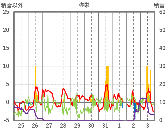 | 日 | 時 | 気温 | 降水 | 風向/風速 | 日照 | 積雪 | 降雪 |