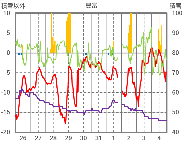 | 日 | 時 | 気温 | 降水 | 風向/風速 | 日照 | 積雪 | 降雪 |
