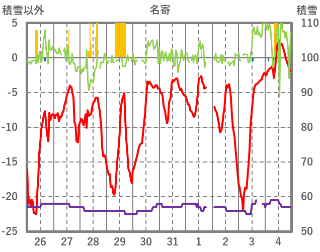 | 日 | 時 | 気温 | 降水 | 風向/風速 | 日照 | 積雪 | 降雪 |