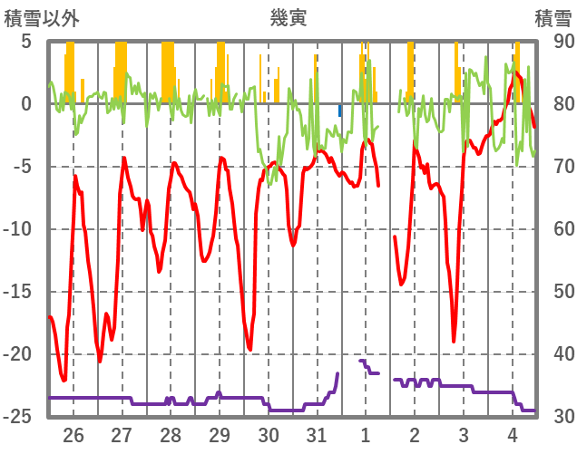 | 日 | 時 | 気温 | 降水 | 風向/風速 | 日照 | 積雪 | 降雪 |