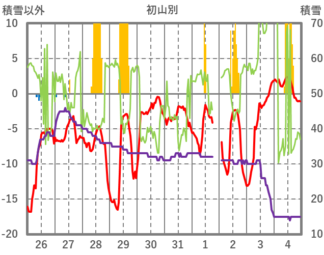 | 日 | 時 | 気温 | 降水 | 風向/風速 | 日照 | 積雪 | 降雪 |