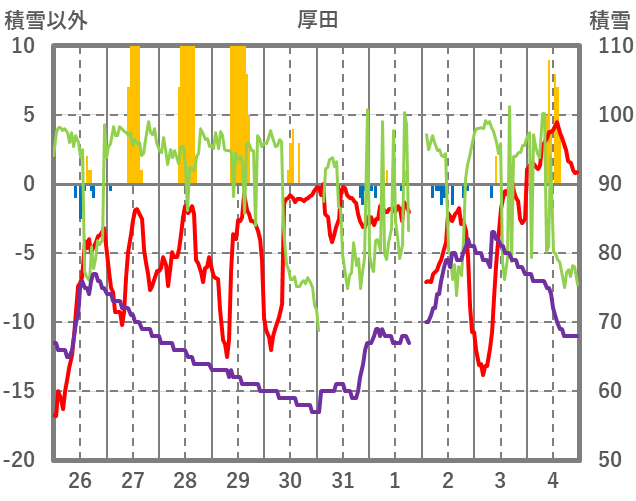 | 日 | 時 | 気温 | 降水 | 風向/風速 | 日照 | 積雪 | 降雪 |