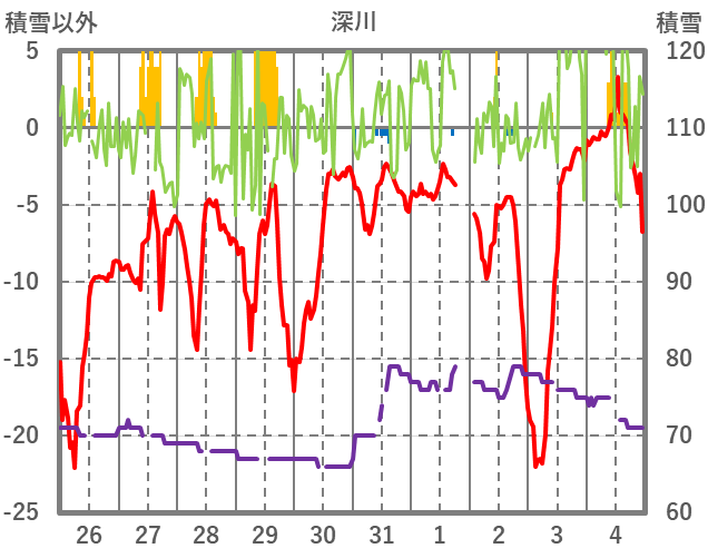 | 日 | 時 | 気温 | 降水 | 風向/風速 | 日照 | 積雪 | 降雪 |