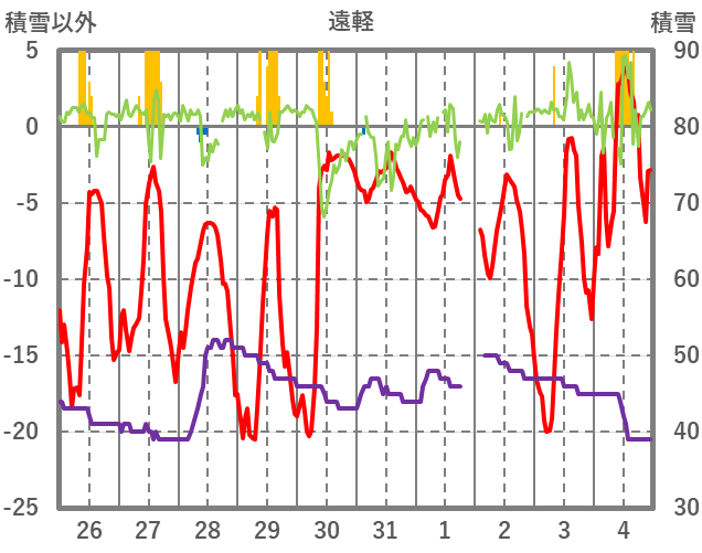 | 日 | 時 | 気温 | 降水 | 風向/風速 | 日照 | 積雪 | 降雪 |