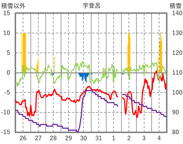 | 日 | 時 | 気温 | 降水 | 風向/風速 | 日照 | 積雪 | 降雪 |