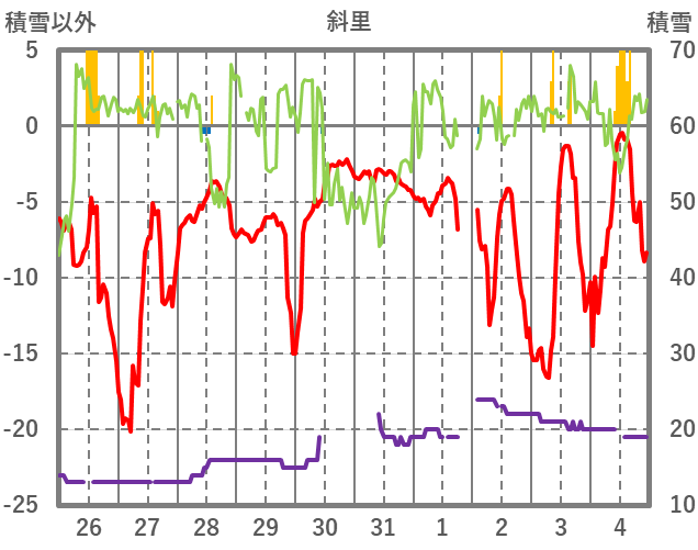 | 日 | 時 | 気温 | 降水 | 風向/風速 | 日照 | 積雪 | 降雪 |