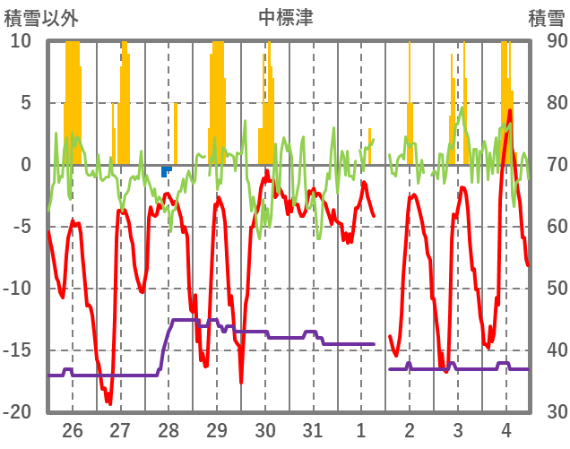 | 日 | 時 | 気温 | 降水 | 風向/風速 | 日照 | 積雪 | 降雪 |