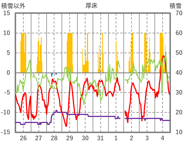 | 日 | 時 | 気温 | 降水 | 風向/風速 | 日照 | 積雪 | 降雪 |