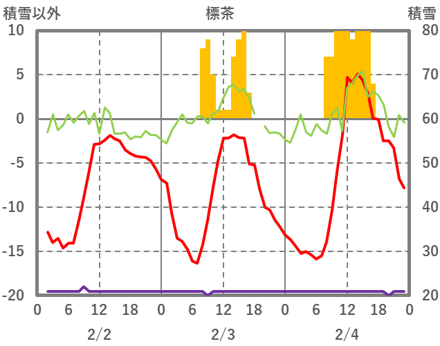 | 日 | 時 | 気温 | 降水 | 風向/風速 | 日照 | 積雪 | 降雪 |