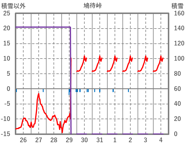 | 日 | 時 | 気温 | 降水 | 風向/風速 | 日照 | 積雪 | 降雪 |