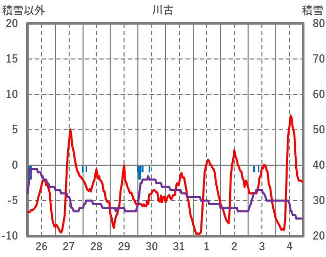 | 日 | 時 | 気温 | 降水 | 風向/風速 | 日照 | 積雪 | 降雪 |